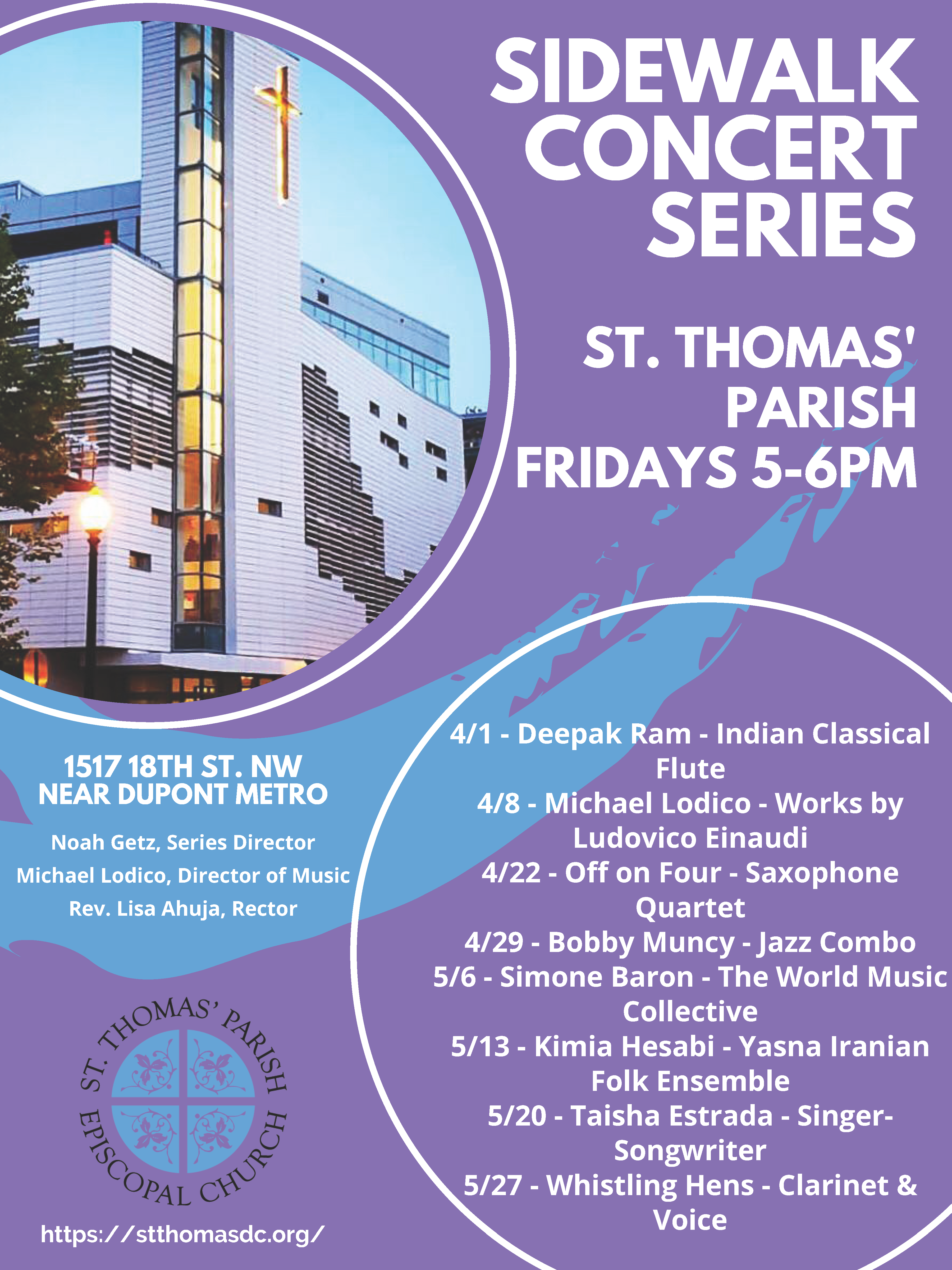 We are excited for this spring Sidewalk Series! Free music concerts in front of St. Thomas’ Parish.